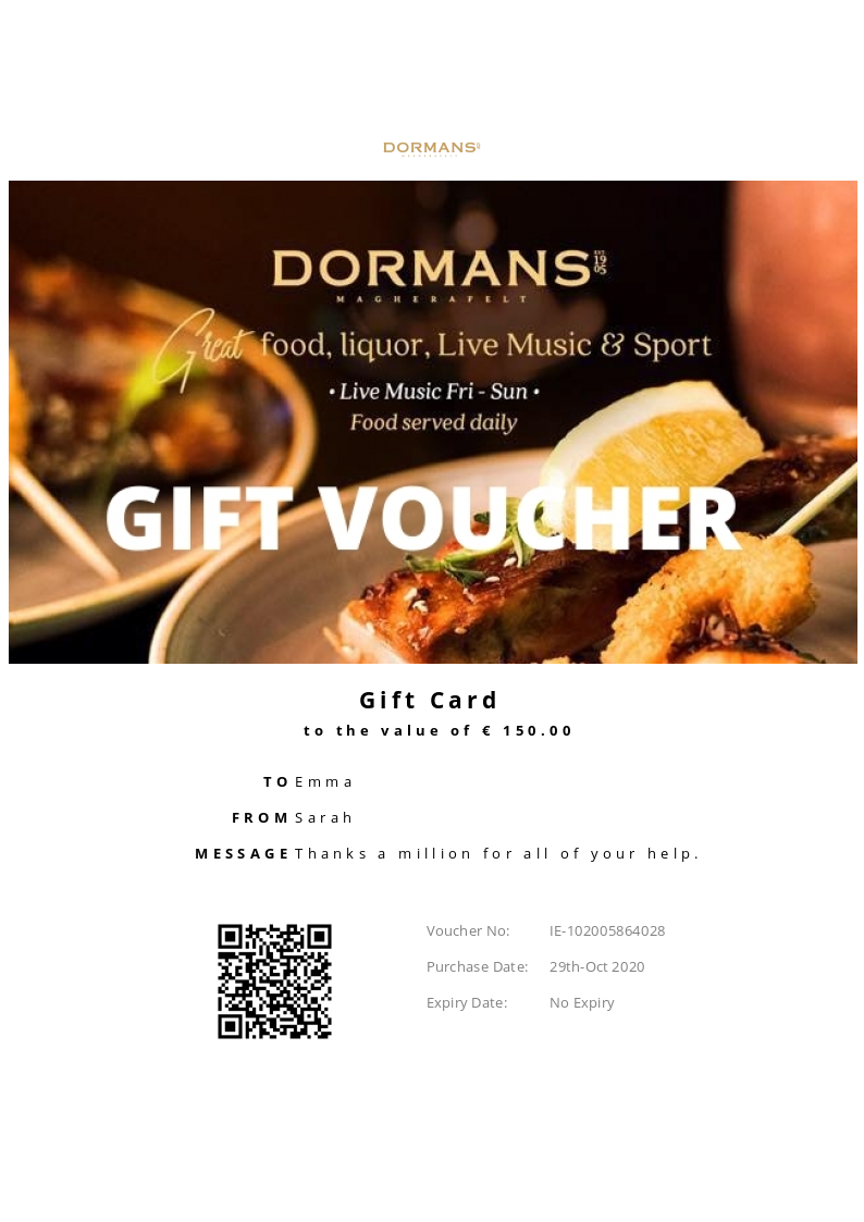 Dormans Bar allows you to purchase instantly printable gift vouchers, special offers and tickets using the Voucher Connect platform.